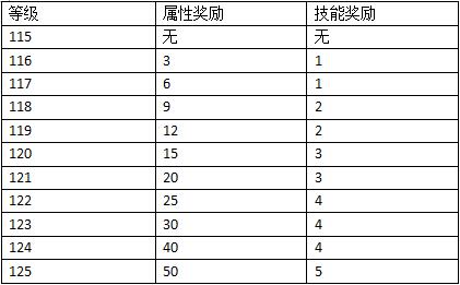 When a character reaches level 115 or above, they can obtain the glorious title of Master and gain the opportunity for reincarnation. After reincarnation, they will lose all previously accumulated experience, attributes, and skills, but with each subsequent level up, they will receive more attribute and skill reward points. They can also use reincarnation-exclusive armor and the ultimate abilities of new growth weapons. This enhancement in strength also means facing more difficult challenges, and of course, gaining the respect of all adventurers in the world. Master Reward Points When reaching level 115 or above to become a Master, the attribute and skill rewards after reincarnation between levels 115 and 125 will change as follows.