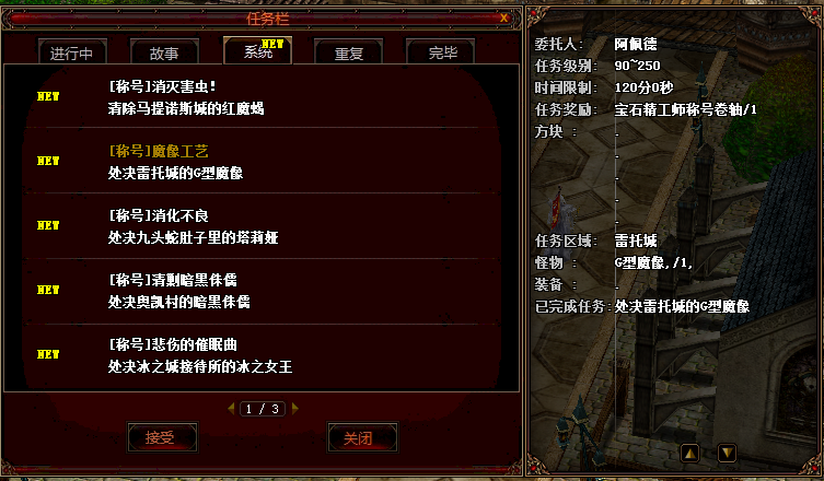 The system quest line is triggered by the player's level. Upon reaching certain levels, some quests will be triggered. Most of these quests involve killing bosses in Cronous' boss maps. They are designed to help players get familiar with the bosses in various maps, their activation methods, and how to complete them. The main rewards for system quests are various titles. After completion, we can apply for these titles. Each title has bonus attributes, and the higher the level of the completed quest, the better the attributes of the title.