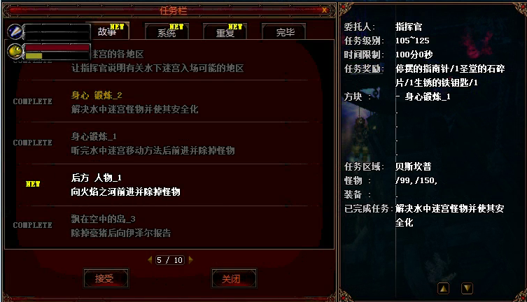 For example: the repeatable quest (Figure2) "Abyss of Sunken Dungeon Clearance" is triggered by completing the story quest (Figure3) "Body and Mind Training 2". Once the story quest is completed once, the repeatable quest can be done repeatedly. Each time this quest is completed, a 1st job change level 108 character can get an additional 26 experience points, level 118 can get 6 points, levels 119 and 120 can get 5 points. This experience is directly added to the character. Some quests have time limits on the number of completions and can only be completed once per day.